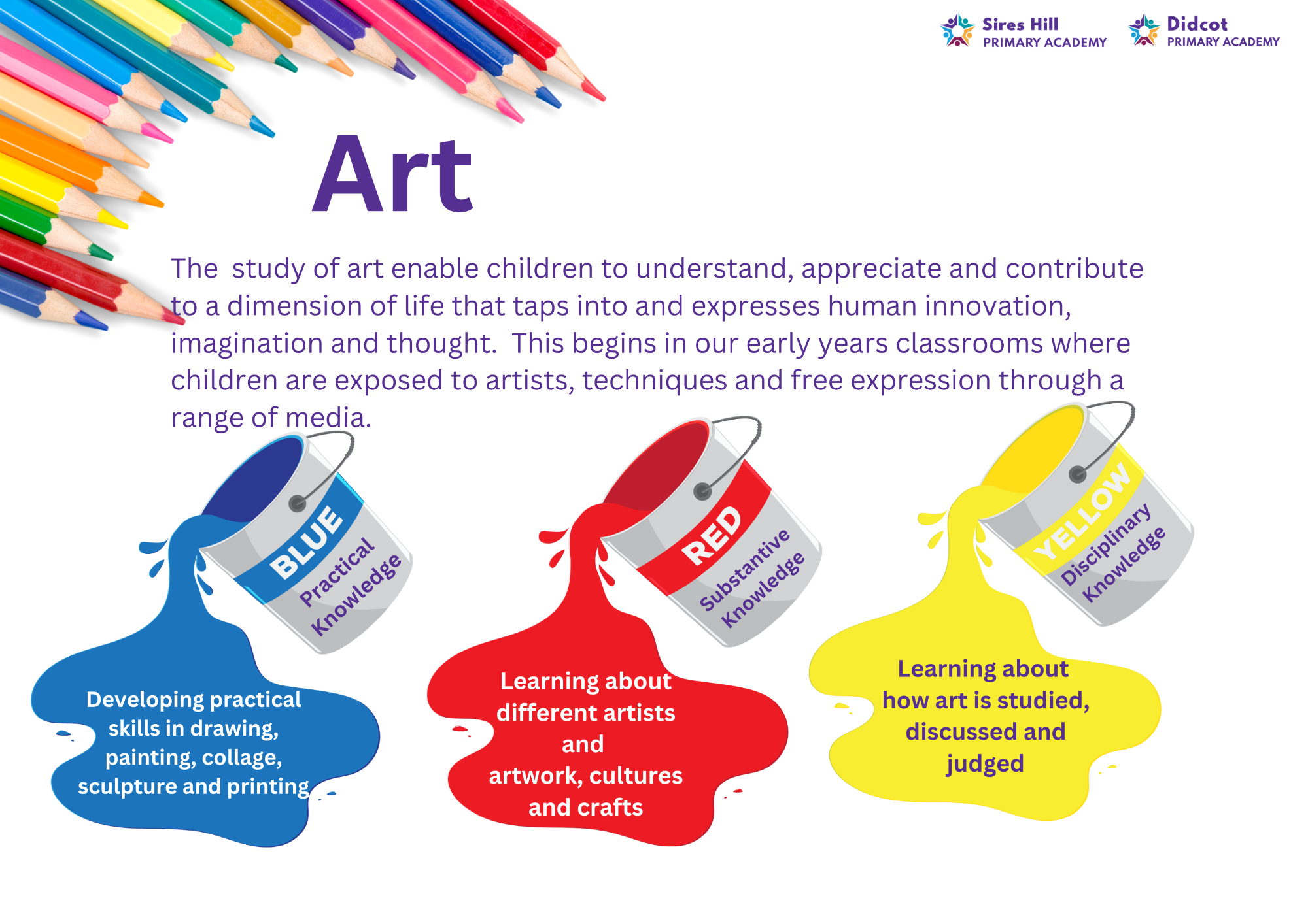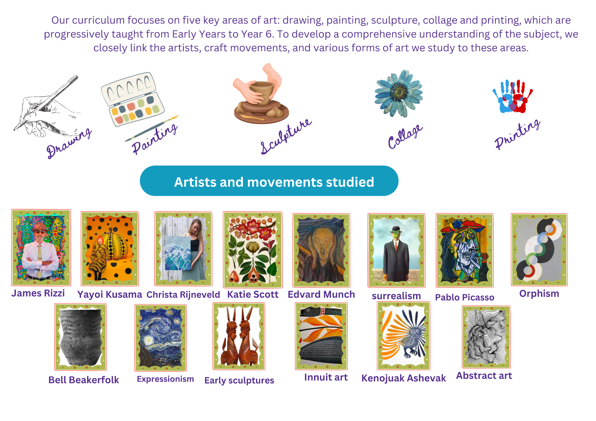 We value Art and Design as an important part of the children’s entitlement to a broad and balanced curriculum. Art and Design provides children with the opportunity to develop and extend skills and knowledge, and an opportunity to express their individual interests, thoughts and ideas. Art, craft and design embody some of the highest forms of human creativity. A high quality art and design education should engage, inspire and challenge pupils, equipping them with the knowledge and skills to experiment, invent and create their own works of art, craft and design. As pupils progress, they should be able to think critically and develop a more rigorous understanding of art and design. They should also know how art and design both reflect and shape our history and contribute to the culture, creativity and wealth of our nation. We want our children to use the local area as inspiration, to learn from other cultures and to respect diversity. We have carefully selected a wide range of artists, craft makers and designers for children to study. Children will develop their understanding of the visual language of art with effective teaching and considered sequences of lessons and experiences. Understanding of the visual elements of art and design will be developed by providing a curriculum which will enable children to reach their full potential. Implementation The skills and knowledge that the children will learn throughout each art topic are mapped across each year group, beginning in Early Years, and are progressive throughout the school.