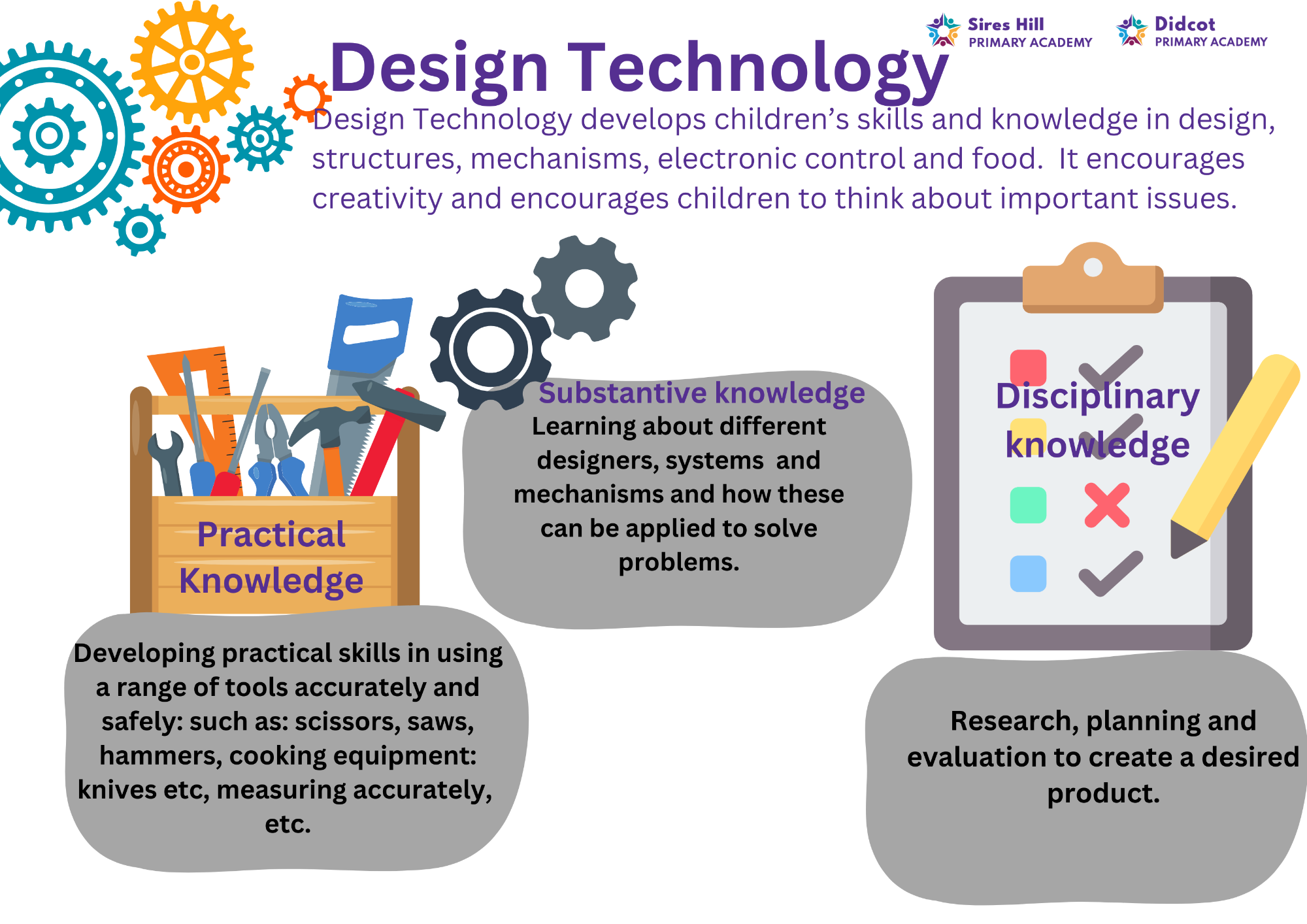 The skills and knowledge that the children will learn throughout each DT topic are mapped across each year group, beginning in Early Years, and are progressive throughout the school.