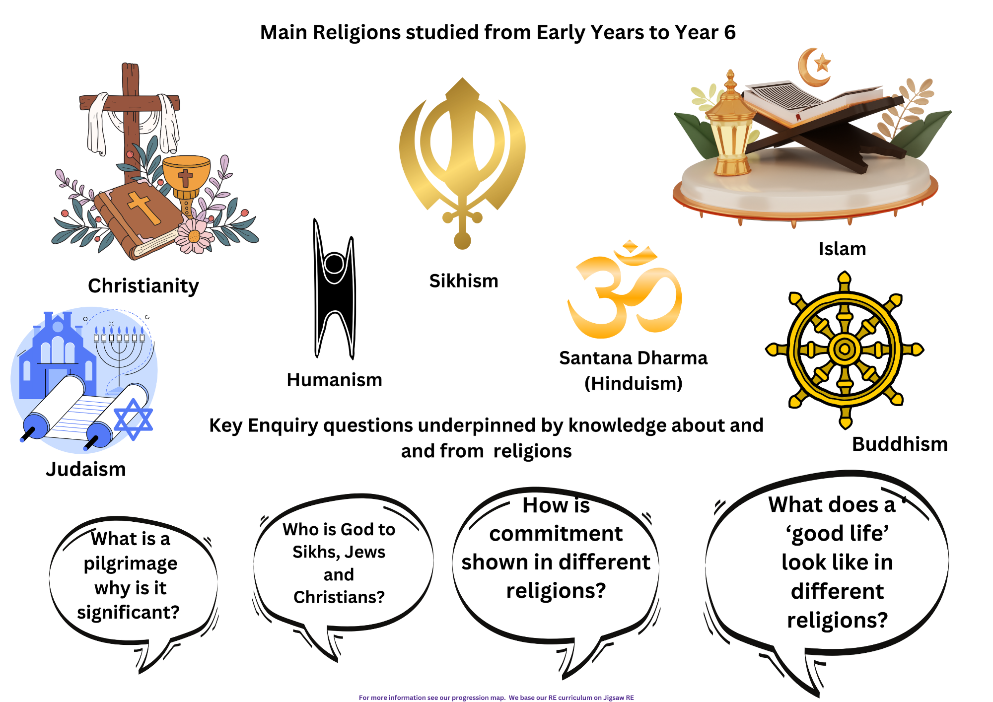 Jigsaw RE is an enquiry based scheme of work, covering the principal world faiths and humanism in a progressive way from Nursery to Year 6.  In the early years, the learning is closely matched to Development Matters to contribute meaningfully to your child's holistic development.  Throughout all enquiries, the children's spiritual, moral, social and cultural education is carefully considered.