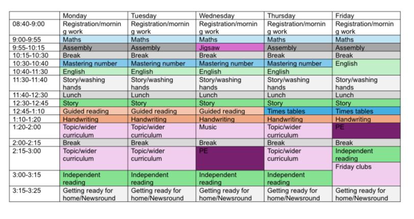 Below you will also find an example timetable to give you an idea of what the week will look like in Year 2: